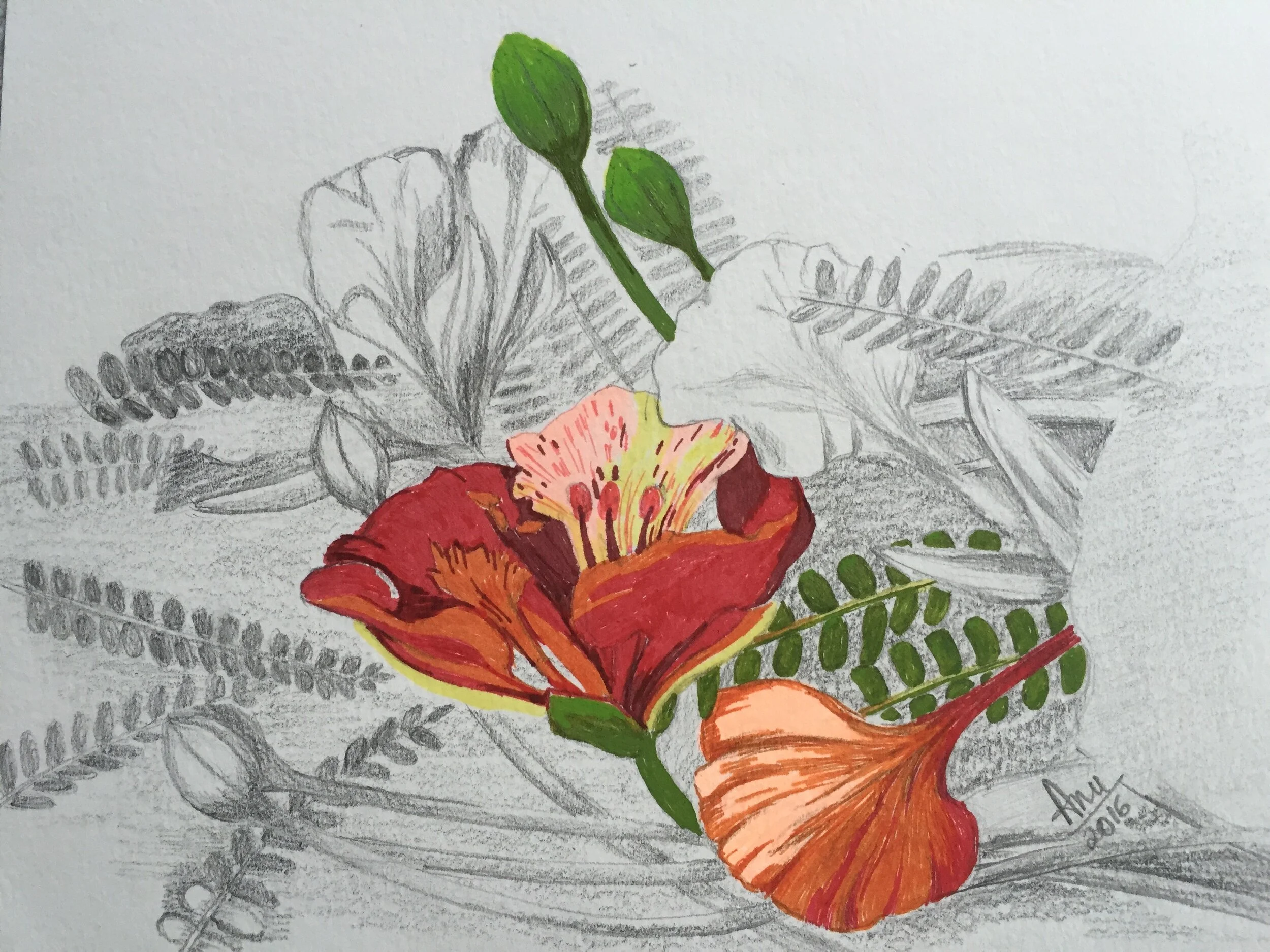 By the evening of the first day, the standard petal appears despondent, its ends curled downwards. On the second day, the flower starts to disintegrate, its organs falling off, one by one. Soon, all of the branches of the Delonix are bare, the crimson canopy from the tree above transformed into a velvety carpet on the ground below.
